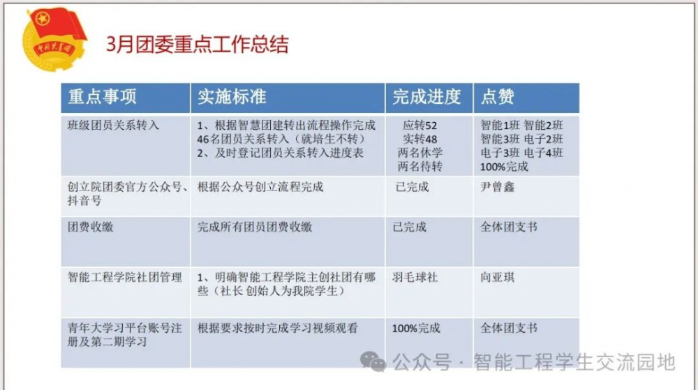 会上,龙宇婷书记对3月团委工作进行总结讲评,对于优秀团支部给予表彰,并对4月团委重点工作进行统一部署。